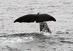 A cauda verticalmente durante a "sonda" de um cachalote em Kaikoura (Nova Zelândia)