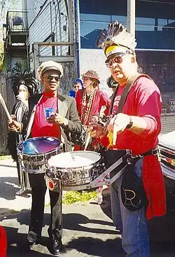 Músicos da Storyville Stompers Brass Band tocando caixas.