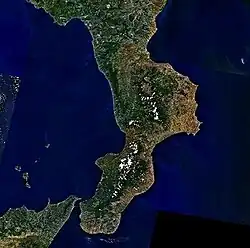Depois encontra-se a corrente das Serre (serras) e finalmente o maciço do Aspromonte, que forma a ponta mais meridional da península Itálica rodeada pelo mar por três lados. Esta estrutura montanhosa única atinge sua altitude máxima em Montalto Uffugo, com 1 955 metros, e está cheia de extensos terraços realizadas pelo homem que descem até o nível do mar.