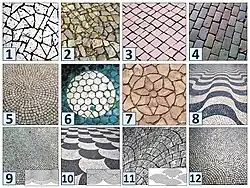 A calçada portuguesa, tal como o nome indica, é originária de Portugal, tendo surgido como a conhecemos nos inícios da década de 40 do século XIX. Esta é amplamente utilizada no calcetamento de áreas pedonais, em passeios, praças, parques, pátios, etc. No Brasil foi um dos pavimentos mais populares utilizados na arquitetura paisagista do século XX, devido à sua flexibilidade de montagem e de composição plástica. A sua aplicação pode ser apreciada em projetos como o do famoso Largo de São Sebastião, em Manaus, no ano de 1901, sendo a primeira calçada artística portuguesa no Brasil, inspirada na Praça Dom Pedro IV, de Lisboa.[1] Em 1906 surgiu o calçadão da Praia de Copacabana (uma obra do prefeito Paulo de Frontin, expandida por Roberto Burle Marx) ou nos espaços da antiga Avenida Central, ambos no Rio de Janeiro.[2][3]