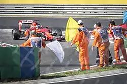 - Na volta três o carro de segurança interveio na pista devido a Sauber de Marcus Ericsson ter parado na brita, e os líderes Lewis Hamilton e Nico Rosberg, entre outros, realizaram uma parada nos boxes para troca de pneus. Quando a corrida foi retomada, Sebastian Vettel era o líder e obteve diferença considerável para os demais, mantendo-a ao longo da corrida. Vettel conquistou a primeira vitória na equipe Ferrari, que voltou a vencer desde o Grande Prêmio da Espanha de 2013.