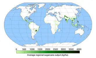 A sacarose, extraída e purificada em fábricas especializadas, é utilizada como matéria-prima na indústria de alimentos humanos ou é fermentada para produzir etanol, que é produzido em escala pela indústria da cana do Brasil. A planta representa a maior colheita do mundo em quantidade de produção.[2] Em 2012 a Organização das Nações Unidas para Alimentação e Agricultura (FAO) estimou em cerca de 26,0 milhões de hectares a área dedicada ao cultivo de cana em mais de 90 países, com uma colheita mundial de 1,83 bilhões de toneladas. O Brasil é o maior produtor de cana-de-açúcar do mundo. Os próximos cinco maiores produtores foram Índia, China, Tailândia, Paquistão e México.
