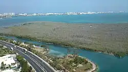 A primeira e mais importante é Isla Cancún ou Zona Hotelera, onde se concentra a maior parte das praias e atividades turísticas por que é reconhecido por este destino. Isla Cancún, é uma terra na forma de "7", com uma extensão de 23km. A ilha, que abriga a maior parte dos hotéis e praias, também de zonas residenciais e o campo de golf Pok Ta Pok, está unida ao continente por três pontes: a ponte Calinda no km 4, a ponte de Club Med no km 20 e a ponte Nizuc no km 22. A zona hoteleira rodeia no interior do "7" no sistema da Laguna Nichupté, composto de sete corpos de água: Laguna Bojórquez, Cuenca del Norte, Cuenca Central, Cuenca Sur, Río Inglés, Del Amor, e Laguneta del Mediterráneo.