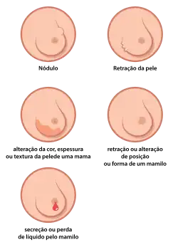 SintomasNódulo numa mama, alterações na forma da mama, retração da pele, líquido no mamilo, pele vermelha e escamosa[1]
