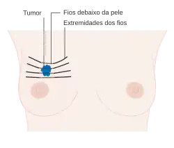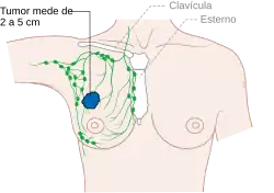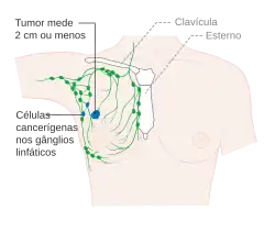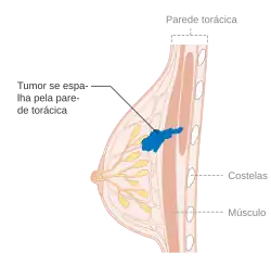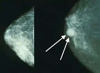 Cancro da mama (português europeu) ou câncer de mama (português brasileiro) ou carcinoma da mama é o cancro que se desenvolve no tecido mamário.[8] Entre os sinais de cancro da mama estão o aparecimento de um nódulo na mama ou perto da mama na zona da axila; alterações na forma ou na aparência da mama, como retração do mamilo, pele da mama ou aréola, mamilo com aparência escamosa, vermelha, inchada ou com saliências e reentrâncias; ou ainda sensibilidade no mamilo e secreção ou perda de líquido pelo mamilo. Em pessoas com a doença disseminada, pode também verificar-se dor óssea, gânglios linfáticos inchados, falta de ar e icterícia.[9]
