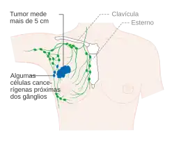 O parâmetro T, seguido de letras ou um número entre 0 e 4, avalia o tamanho e localização do tumor. Os estádios T0 e Tis são situações pré-cancro. Nos estádios T1 a T3 o tumor ainda se encontra restrito à mama e aos gânglios linfáticos regionais. O parâmetro N refere-se à avaliação dos nódulos ou gânglios linfáticos. No caso do cancro da mama, os gânglios regionais são os que se encontram na axila, superiores e inferiores à clavícula e inferiores ao esterno, sendo todos os restantes denominados "distantes". Quando os gânglios são avaliados antes da cirurgia pode ser acrescentado o sufixo "c" (clínico); quando são avaliados na cirurgia, de forma mais precisa, pode ser acrescentado o sufixo "p" (patológico). O parâmetro M refere-se à avaliação das metástases, ou seja, se o cancro se espalhou para outras partes do corpo.[88][89][90]