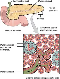 O cancro (português europeu) ou câncer (português brasileiro) do pâncreas surge quando as células do pâncreas, um órgão glandular atrás do estômago, se começam a multiplicar de forma descontrolada e formam um tumor. Estas células cancerígenas têm a capacidade de invadir outras partes do corpo.[10] Existem diversos tipos de cancro do pâncreas. O mais comum, adenocarcinoma pancreático, corresponde a aproximadamente 85% dos casos e em muitas situações o termo "cancro do pâncreas" é usado para designar apenas este tipo. Estes adenocarcinomas começam-se a formar na parte do pâncreas que produz as enzimas digestivas. A partir destas células podem também surgir vários outros tipos de cancro, que no conjunto representam a maioria dos não-adenocarcinomas. Um a dois em cada 100 casos de cancro do pâncreas são tumores neuroendócrinos que se formam a partir das células do pâncreas produtoras de hormonas. Este tipo é geralmente menos agressivo que o adenocarcinoma pancreático.[2]