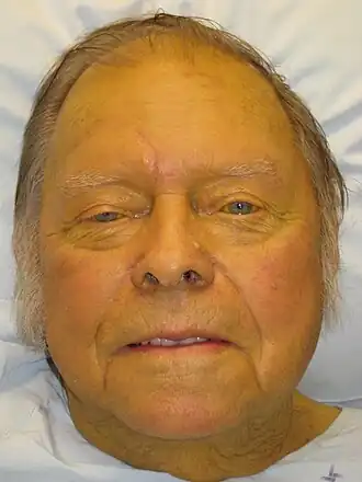 - Icterícia, uma coloração amarelada da parte branca dos olhos ou da pele, com ou sem dor, e possivelmente em conjunto com urina mais escura do que o normal. Isto deve-se ao facto dos cancros na cabeça do pâncreas obstruírem o ducto colédoco na parte em que atravessa o pâncreas.[27]
