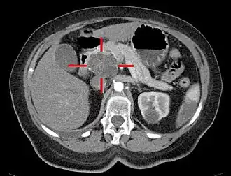 | TAC com coloração artificial e elevado nível de contraste. A cruz delimita um adenocarcinoma macrocístico na cabeça do pâncreas. | |