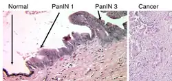 - A primeira é a neoplasia intraepitelial pancreática. Trata-se de anomalias microscópicas no pâncreas, que são frequentemente encontradas em autópsias de pessoas sem cancro diagnosticado. Estas lesões podem evoluir de baixo grau para alto grau e posteriormente para um tumor. Em mais de 90% dos casos, em qualquer dos graus, observa-se uma deficiência no gene KRAS, enquanto nos graus 2 e 3 se verifica frequentemente lesões em mais três genes: CDKN2A (p16), p53 e SMAD4.[2]