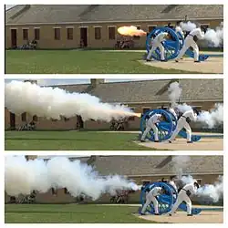 No último decênio do século XIX criou-se um sistema de freio e recuperação que permite ao canhão deslizar sobre um berço. Ao recuar com o tiro, o canhão comprime poderosas molas; vencida a força de recuo, as molas recobram a sua forma original. Em outro processo, as molas são substituídas por cilindros de gás que, após o recuo, dilatam-se, voltando o canhão à posição original.