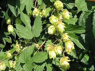 Lúpulo (Humulus lupulus) com frutos quase maduros.