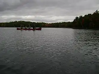 Grupo praticando canoagem em um lago de Ontário, Canadá.