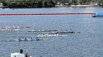 São disputadas duas baterias preliminares, com até oito barcos cada, em que o vencedor avança diretamente para a bateria final. Os demais barcos disputam duas baterias de repescagem, denominadas semifinais, das quais se classificam para a bateria final os três barcos mais rápidos de cada semifinal. Os oito barcos classificados disputam a Final A e definem os medalhistas, enquanto que os desclassificados disputam a Final B.