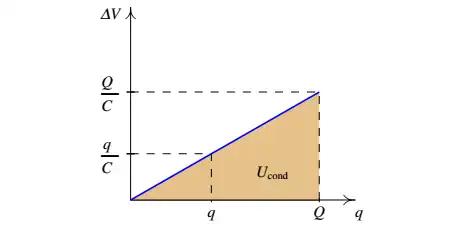 A energia total armazenada no condensador obtêm-se por integração, de até (área sob a reta no gráfico de em função de , na figura abaixo). O resultado é: