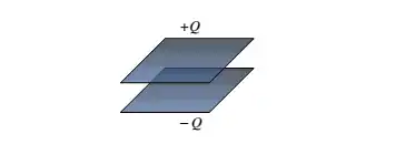Um capacitor plano (figura abaixo) é formado por duas armaduras planas, de área A, paralelas e separadas por uma distância constante d , se as cargas nas armaduras forem e , o campo elétrico entre as armaduras é aproximadamente constante e com módulo