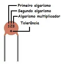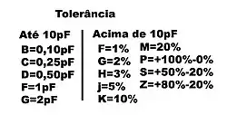 Os capacitores cerâmicos apresentam impressos no próprio corpo um conjunto de três algarismos e uma letra. Para se obter o valor do capacitor os dois primeiros algarismos representam os dois primeiros dígitos do valor do capacitor, e o terceiro algarismo (algarismo multiplicador) representa o número de zeros à direita. A letra representa a tolerância do capacitor (a qual pode ser omitida), que é a faixa de valores em que a capacitância variará. Para os capacitores cerâmicos até 10 pF esta é expressa em pF. Para os acima de 10 pF é expressa em porcentagem. Por exemplo um capacitor com 224 F impresso no próprio corpo, possuirá uma capacitância de 220 000 pF com uma tolerância de +/- 1% (seu valor pode ser um ponto percentual à mais ou a menos desse valor).[13]