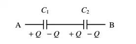 A figura abaixo mostra dois capacitores ligados em série, entre os pontos A e B. Se os capacitores estiverem inicialmente descarregados, no momento em que for introduzida uma diferença de potencial entre os pontos A e B, circulará uma carga que entra pelo ponto a maior potencial (A na figura) e sai pelo ponto a menor potencial.