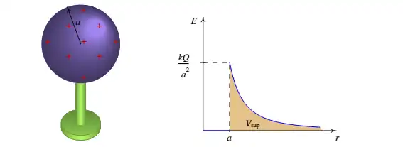 A energia potencial elétrica que terá uma carga pontual q quando for colocada na superfície da esfera, é dada pela equação onde é a diferença de potencial entre um ponto na superfície da esfera e um ponto no infinito, onde a esfera já não produz nenhuma energia potencial na carga .[10]