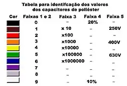 Para a identificação dos valores do capacitor de poliéster é usado um conjunto de 7 faixas coloridas (conforme tabela), embora seja um método em desuso pelos fabricantes, no qual cada faixa representará respectivamente: primeiro algarismo, segundo algarismo, algarismo multiplicador, tolerância e tensão. O valor é obtido em pF. Os capacitores de poliéster não tem polaridade.[14]
