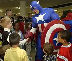 Ator fantasiado de Capitão América em um evento de quadrinhos nos Estados Unidos.