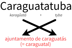Caraguatatuba é vocábulo tupi, que segundo Silveira Bueno significa "lugar de muitos caraguatás", ou seja, "caraguatal", "caraguatazal". Do tupi karagûatá: designação comum dada a várias espécies de plantas epífitas e terrestres da família das bromeliáceas, também conhecidas como gravatá, e tyba: abundância, grande quantidade, ajuntamento, termos que juntos formam uma relação genitiva, dando significado ao nome no município.[14]