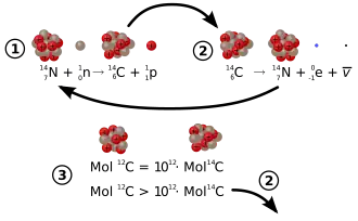 Reagindo com o oxigênio do ar forma dióxido de carbono ( C14O2 ), cuja quantidade permanece constante na atmosfera. Este C14O2 , juntamente com o C12O2 normal, é absorvido pelos animais e vegetais sendo, através de mecanismos metabólicos, incorporados a estrutura destes organismos. Enquanto o animal ou vegetal permanecer vivo a relação quantitativa entre o carbono-14 e o carbono-12 permanece constante. A partir da morte do ser vivo, a quantidade de C-14 existente em um tecido orgânico se dividirá pela metade a cada 5 730 anos. Cerca de 50 mil anos depois, esta quantidade começa a ser pequena demais para uma datação precisa.