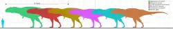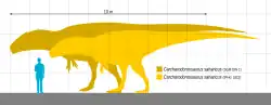 Comparação de tamanho de um C. saharicus entre alguns membros da Carcharodontosauridae