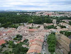 A comuna é tradicionalmente dividida em duas, a cidade baixa, que ocupa as margens do rio Aude a ocidente, e a cidade alta (ou cité; cidadela), que ocupa a colina debruçada sobre o Aude. A cidadela ocupa uma pequena meseta formada pela erosão do Aude, a cerca de 150 metros de altitude. A cidade baixa situa-se ao nível do Aude, a 100 metros de altitude.[9]