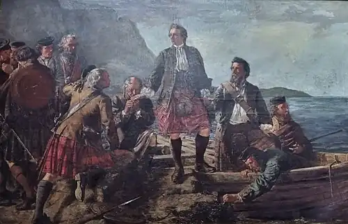 Encorajado pela vitória francesa na Batalha de Fontenoy em maio de 1745, Carlos Eduardo e sua comitiva zarparam em direção à Escócia em 5 de julho.[64] Enquanto navegavam para o norte, Carlos Eduardo e sua comitiva foram bombardeados pelo HMS Lion no Mar Céltico.[65][66] O Du Teillay, onde estava Carlos Eduardo, conseguiu escapar, enquanto o Elizabeth enfrentou o HMS Lion em combate direto.[65][66] Com a retirada do Lion, o Elizabeth teve que retornar a Brest para reparos, levando consigo a maior parte dos suprimentos de Carlos Eduardo, incluindo cerca de 1.800 espadas, 8 canhões e a maioria dos 1.500 mosquetes adquiridos.[65][50] O Du Teillay, porém, continuou a missão e, em 23 de julho, desembarcou Carlos Eduardo e sete companheiros na ilha de Eriskay.[65] Esse grupo ficou conhecido como "Os Sete de Moidart", e incluía exilados irlandeses como o ex-oficial francês John O'Sullivan e o secretário de Carlos, George Kelly. Muitos clãs das Terras Altas, tanto católicos quanto protestantes, ainda apoiavam as reivindicações jacobitas, e Carlos Eduardo esperava uma recepção calorosa, acreditando que os jacobitas se levantariam por todo o Reino Unido.[67] No entanto, foi recebido com frieza pelos líderes locais. Muitos, como os MacDonalds de Sleat e Norman MacLeod, aconselharam-no a voltar à França.[68] Conscientes das consequências de um fracasso e da ausência de apoio militar francês, eles não viram em Carlos Eduardo a liderança prometida.[69] Apesar disso, Carlos Eduardo não se deixou abater e seguiu viagem até Loch nan Uamh.[56] Sem o apoio esperado da marinha francesa, decidiu levantar um exército na Escócia.[70]