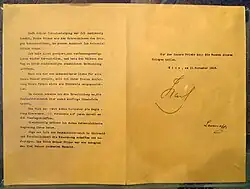 A responsabilidade pela guerra presente não recai sobre mim; contudo, desde a minha ascensão ao trono, tenho envidado constantes esforços para libertar o povo da calamidade abominável do conflito. Não nutro qualquer intenção de impedir que o povo estabeleça uma vida nacional conforme os preceitos constitucionais e trilhe o caminho para o desenvolvimento de um Estado independente. O meu amor pelo povo permanece inalterado, e não considero digno que eu próprio me torne obstáculo ao futuro de uma nação que aspira voar rumo à liberdade. Desde tempos anteriores, venho reconhecendo a ordem estatal futura conforme decidida pelo Governo Provisório da Áustria Alemã. O povo será doravante confiado às mãos dos representantes do governo. Declaro, assim, que renuncio à execução de todos os atos de governo, bem como à dissolução do atual gabinete. É meu mais sincero desejo que o povo, em espírito de unidade e concórdia, estabeleça uma nova ordem estatal. A felicidade do povo tem sido, desde o início, a mais fervorosa das minhas preces, e apenas mediante a paz interna será possível curar as feridas da guerra.[30]