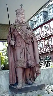 Carlos Magno ou Carlos, o Grande (em latim: Carolus Magnus, em alemão: Karl der Große, em francês: Charlemagne) (2 de abril de 742 – Aachen, 28 de janeiro de 814)[3] foi Rei dos Francos a partir de 768, Rei dos Lombardos a partir de 774 e Imperador dos Romanos a partir do ano 800. Durante o início da Idade Média, Carlos Magno uniu a maior parte da Europa ocidental e central. Ele foi o primeiro imperador reconhecido a governar a Europa Ocidental desde a queda do Império Romano do Ocidente cerca de três séculos antes.[4] O Estado franco expandido que Carlos Magno fundou é conhecido como o Império Carolíngio. Mais tarde, ele foi canonizado pelo antipapa Pascoal III, ato considerado inválido. Atualmente é objeto de debate se o imperador teria sido ou não pelo menos beatificado, o que seria um passo no caminho da santidade segundo a Igreja Católica tradicional.