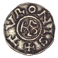 Um denário de Carlos Magno datado de c. 812–814 com a inscrição KAROLVS IMP AVG (Karolus Imperator Augustus) (em latim)