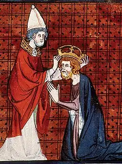 Carlos Magno era o filho mais velho de Pepino, o Breve e Berta de Laon, nascido antes de seu casamento canônico.[5] Ele se tornou rei dos francos em 768 após a morte de seu pai, inicialmente como co-governante ao lado de seu irmão Carlomano I, até a morte deste último em 771.[6] Como único governante, ele continuou a política de seu pai em relação ao papado e se tornou seu protetor, removendo os lombardos do poder no norte da Itália e liderando uma incursão na Espanha muçulmana. Ele fez campanha contra os saxões a leste, cristianizando-os sob ameaça de pena de morte. Ele atingiu o auge de seu poder em 800, quando foi coroado "imperador dos romanos" pelo Papa Leão III no dia de Natal na Antiga Basílica de São Pedro, em Roma.