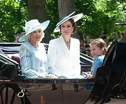 Carlota com a rainha Camila (na época Duquesa da Cornualha, à esquerda) e sua mãe Catarina (na época Duquesa de Cambridge, à direita), no Trooping the Colour de 2022.
