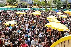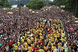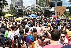 É considerado carnaval de rua todo conjunto de manifestações carnavalescas voluntárias, sejam organizadas ou não, sem finalidade lucrativa e de cunho festivo, que ocorrem na forma de "blocos", "cordões", "bandas" ou semelhantes.[56]Esses blocos são realizados na própria cidade de São Paulo, em circuitos urbanos notáveis, como grandes avenidas, ruas e praças, acompanhados de carros de som, bandas e com diversos instrumentos de percussão. Possuem nomes bastantes característicos, trazendo trocadilhos e frases marcantes para agitar ainda mais esse clima de folia nessa época do ano, como por exemplo "Quem me viu Mentiu", "Meu Santo é Pop" entre outros. [57]Não faltou opções de estilos e públicos nos blocos deste ano que conteve blocos com música eletrônica,[58] sucessos dos anos 90,[59] discursos políticos[60] e feministas.[61]