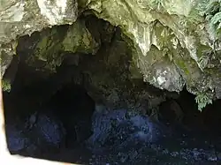 A entrada de uma caverna no fundo de uma dolina, próximo a