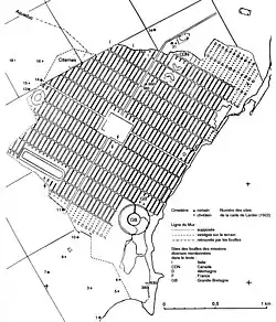 Além disto, a cidade seria talvez totalmente cercada por outras duas grandes muralhas, circulando toda a extensão da península. Dividia-se em três partes: a byrsa, uma acrópole onde ficavam o tesouro, o arquivo público e a estátua do deus Ba'al Hammon; uma área urbana residencial onde ficavam os templos e a praça de julgamentos; um distrito aparentemente agrícola e separado do resto por outra muralha, chamado Megara. Um grande cemitério separava a byrsa do restante da área urbana e cemitérios menores existiam entre esta última e as muralhas. Suas construções eram, ao que parece, de estilo pobre e feitas de materiais baratos, com grandes influências egípcias e gregas. Suas casas não teriam janelas, exceto para pátios internos.