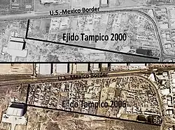 O conflito do governo mexicano com o antigo Ejido Tampico data de 1970, quando eles expropriaram 320 hectares (790 acres) do Ejido Tampico para construir uma nova pista e terminal de passageiros no aeroporto de Tijuana e concordaram em pagar aos deslocados ejidatarios (os agricultores comunais) 1,4 milhões de pesos (112.000 dólares em 1970). Quando o governo mexicano falhou em indenizar os ejidatários por suas terras agrícolas perdidas, eles reocuparam uma área de 79 hectares (200 acres) do aeroporto de Tijuana e ameaçaram um conflito armado. De 1970 a 2000, as terras ocupadas no aeroporto de Tijuana permaneceram relativamente subdesenvolvidas. Em 1999, o aeroporto de Tijuana foi privatizado e passou a fazer parte de uma rede de 12 aeroportos conhecida como Grupo Aeroportuario del Pacífico. Em uma tentativa de resolver a disputa e remover os ejidatários do aeroporto privatizado de Tijuana, o governo mexicano estabeleceu um valor nos 320 hectares expropriados (790 acres) em 1,2 milhão de pesos (125.560 dólares em 1999), enquanto os ejidatários do antigo Ejida Tampico, levando em conta o aumento no valor das propriedades de 1970 a 1999 e a privatização do aeroporto de Tijuana, estabeleceram um valor comercial em suas terras perdidas em 2,8 bilhões de pesos (294 milhões de dólares). Em 2002, o presidente mexicano Vicente Fox, que havia prometido resolver o problema, também falhou.[136] Os ejidatários passaram a desenvolver comercialmente a área de 79 hectares (200 acres) no aeroporto de Tijuana, arrendando prédios e lotes para empresas de transporte e armazenamento. Em 2006 o desenvolvimento não permitido permitiu a construção de um "super túnel" de drogas de 2.400 pés (730 metros) originário do antigo Ejido Tampico e adjacente à pista do aeroporto de Tijuana.[137] Como túneis de drogas anteriores, cruzou a fronteira dos EUA com o México até um depósito em Otay Mesa, em San Diego, com capacidade para transportar cargas de várias toneladas de narcóticos.[138][139]