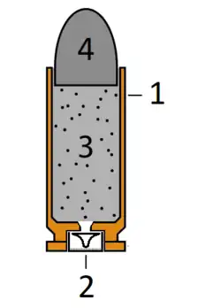 São quatro os principais elementos de um cartucho de munição de arma de fogo de cano raiado, e de percussão central:[2]