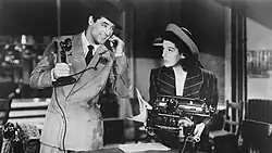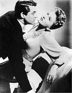 The Awful Truth deu início ao que o crítico de cinema Benjamin Schwarz do The Atlantic mais tarde chamou de "a temporada mais espetacular de um ator em filmes americanos" para Grant.[114] Em 1938, estrelou ao lado de Katharine Hepburn na comédia maluca Bringing Up Baby, contendo cenas com um leopardo e frequentes sequências de brigas verbais entre a dupla. Ele estava inicialmente incerto sobre como interpretar seu personagem, mas o diretor Howard Hawks disse para imitar Harold Lloyd.[115] Grant teve mais liberdade nas cenas cômicas, na edição do filme e ainda ajudou Hepburn em seu timming cômico.[116] Apesar de perder mais de US$ 350.000 para a RKO,[117] o filme recebeu ótimas críticas.[118] Ao final daquele mesmo ano, o duo também estrelaram a comédia romântica Holiday que não foi um grande sucesso de bilheteria e fez Hepburn ser caluniada pela mídia com a alcunha "veneno de bilheteria".[119]