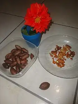 Noz aberta da pecan, revelando o endocarpo e semente- Noz exposta da pecan