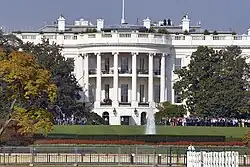 ![]() Parte superior: fachada norte com um pórtico colunado voltado para o Gramado Norte e Lafayette Square Parte inferior: fachada sul com um pórtico semicircular voltado para o Gramado Sul e The Ellipse | |