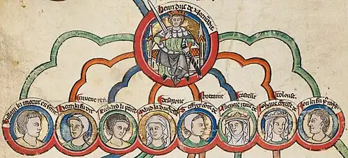 | Artur I, Duque da Bretanha 1187–1203 | Henrique III, Rei de Inglaterra 1207–1272 | Ricardo, Rei dos Romanos 1209–1272 | |||||||||||||||||||||||||||||||||||||||||||||||||||||||||||||||||||