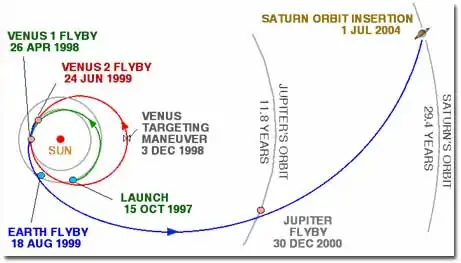 Para conseguir um momento linear interplanetário estando em voo, a trajetória da missão incluiu várias manobras de estilingues gravitacionais: dois sobrevoos por Vênus, mais um pela Terra e finalmente um por Júpiter. A nova passagem pela Terra, dois anos depois de lançada, foi a única que ofereceu algum perigo para os seres humanos. A manobra foi bem sucedida, com a nave passando a 1 171 km de altitude em 18 de agosto de 1999.[19] Caso houvesse um mau funcionamento fazendo a nave cair na atmosfera e colidindo com a superfície, o estudo do impacto ao meio ambiente feito pela NASA indicou que, no pior dos casos – em caso de entrada em ângulo de queima total na atmosfera – uma quantidade considerável do plutônio-238 contido nos geradores seria dispersada no ar, de maneira a que mais de cinco bilhões de pessoas poderiam ser expostas a ele, causando cerca de cinco mil mortes adicionais por câncer entre a população, mas as chances disso acontecer seriam de 1 em 1 milhão.[20]