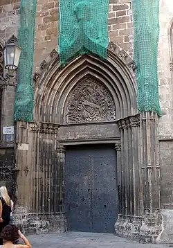 - Porta da Piedade: Dá entrada ao claustro, junto à abside com um arco canopial flanqueado por uns altos pináculos lavrados com grande fineza. No tímpano há um relevo de madeira com a representação da Piedade (ou seja, a representação da dor de Maria com Jesus morto no regaço) rodeada com símbolos da Paixão, obra do escultor alemão Michael Lochner, estabelecido em Barcelona desde o ano 1483; no rincão inferior direito do tímpano e em medida pequena está representado o cónego Berenguer Vila, que foi o doador que financiou o relevo.[10] Esta porta facilita a entrada no templo, já que está situada junto da abside ao nível do cruzeiro, no lado da Epístola, permitindo a entrada na catedral através do claustro.