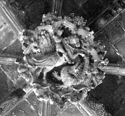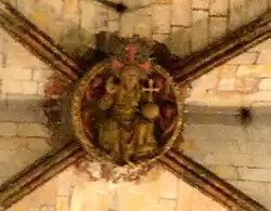 - Um homem vestido com túnica e lutando com um leão, no qual finca uma adaga. Supõe-se que representa Sansão, por se parecer com outras representações contemporâneas, apesar, segundo o Antigo Testamento, mesmo ter matado o leão com suas próprias mãos e não com uma adaga.
