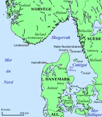 - ↑ «Kattegatt». Norstedts uppslagsbok (em sueco). Estocolmo: Norstedts. 2007–2008. p. 627. 1488 páginas. ISBN 9789113017136