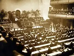 A Liga das Nações foi uma organização internacional de manutenção da paz fundada após a Primeira Guerra Mundial com o objetivo explícito de prevenir guerras futuras.[14] Os métodos da Liga incluíam desarmamento, segurança coletiva, resolução de disputas entre países por meio da diplomacia de negociação e melhoria do bem-estar global. A filosofia diplomática por trás da Liga representou uma mudança fundamental no pensamento do século anterior. A velha filosofia de "concerto de nações", nascida do Congresso de Viena de 1815, via a Europa como um mapa mutável de alianças entre Estados-nação, criando um equilíbrio de poder mantido por exércitos fortes e acordos secretos. Sob a nova filosofia, a Liga atuaria como um governo de governos, com o papel de resolver disputas entre nações individuais em um fórum aberto e legalista. Apesar de o presidente dos Estados Unidos Woodrow Wilson ser o arquiteto-chefe da Liga, os Estados Unidos nunca se juntaram à Liga das Nações, o que diminuiu seu poder e credibilidade, a adição de uma crescente potência industrial e militar mundial como os Estados Unidos poderia ter adicionado mais força por trás das demandas e pedidos da Liga.