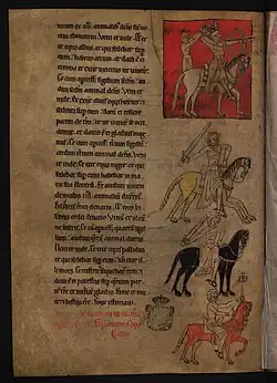 - Cavalos e cavaleiros: Em muitas culturas, o cavalo é símbolo de impetuosidade e impulsividade relacionadas com os desejos humanos, além de ser associado com água e fogo por serem muitas vezes incontroláveis. Também é tido como a relação com o divino servindo de guia de almas, sendo muitas vezes enterrados junto com seus donos. Exprime também vigor e virilidade, por vezes simbolizando a juventude. No contexto histórico, principalmente nos campos de batalha, o cavalo era treinado muitas vezes para matar soldados com suas patas ou sua boca,[2] portanto nessa narrativa esses cavalos e seus cavaleiros podem representar (e muitas interpretações os descrevem assim) uma cavalgada (campanha) com toques de guerra trazendo suas consequências por onde passam.